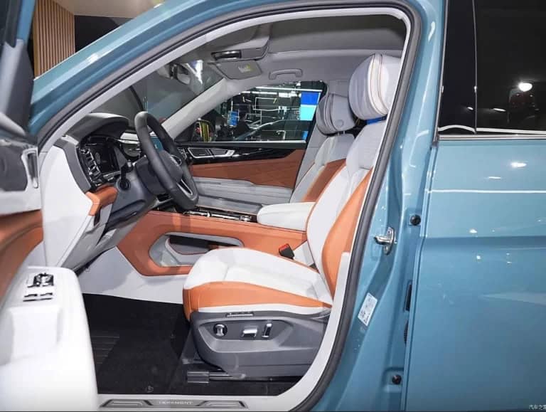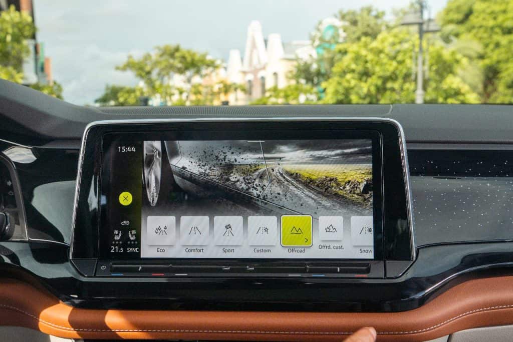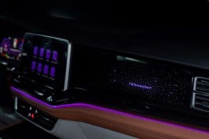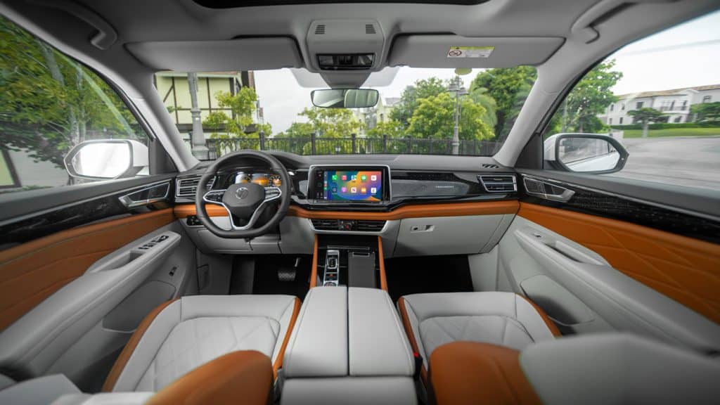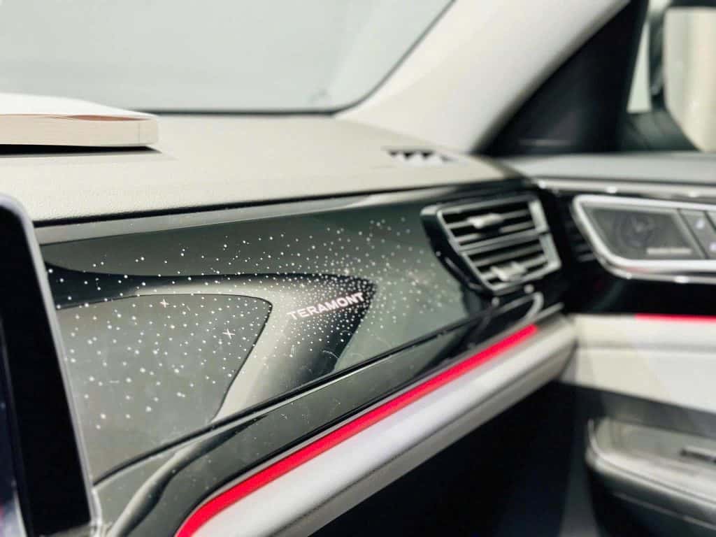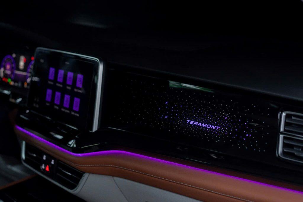 Bước vào bên trong, bạn sẽ bị ấn tượng bởi không gian nội thất rộng rãi và sang trọng của Teramont President. Chất liệu da cao cấp được áp dụng ở nhiều bề mặt tiếp xúc. Mặt táp lô được thiết kế kiểu sao băng rơi cùng dòng chữ Teramont, đi liền với hệ thống đèn Ambient light 30 màu tạo nên một không gian ấm cúng và đẳng cấp.