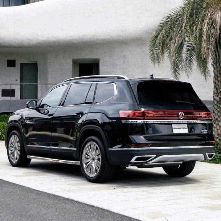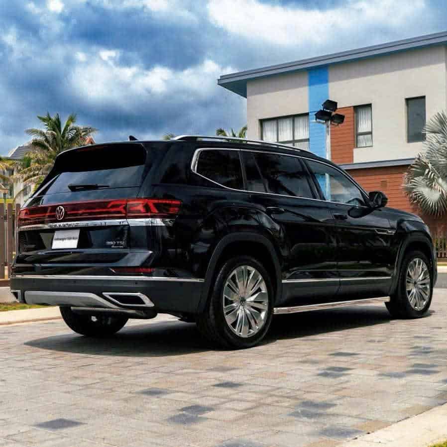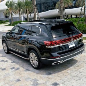 Phía đuôi xe cũng được tô điểm nhấn bởi các thanh viền mạ Chrome và dập nổi tên xe Teramont. Phía dưới cản sau là ống xả kép hình thang mạ crom được đặt bên dưới tấm cản sau. Trên cùng là ăng ten dạng vây cá mập, giúp tăng thêm tính thể thao cho dòng xe SUV này.